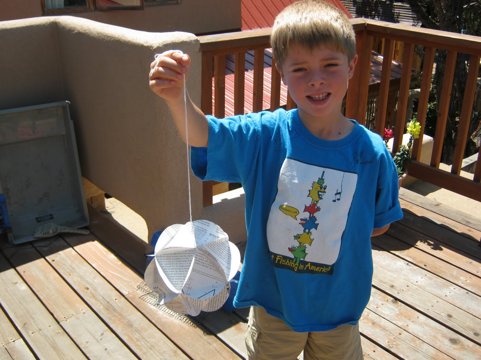 Day 156: So now I have a bunch of physics book scraps to use up, so I made a hanging sphere with a few of them. I made this with one of the kids I get paid to hang out with (lucky me!) His name is Aiden and he is 9 years old (doesn't he look proud?) He decided to hang it over his bed.